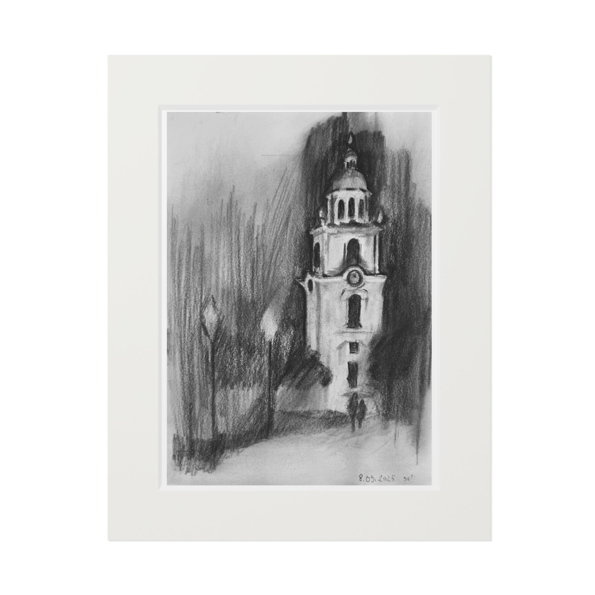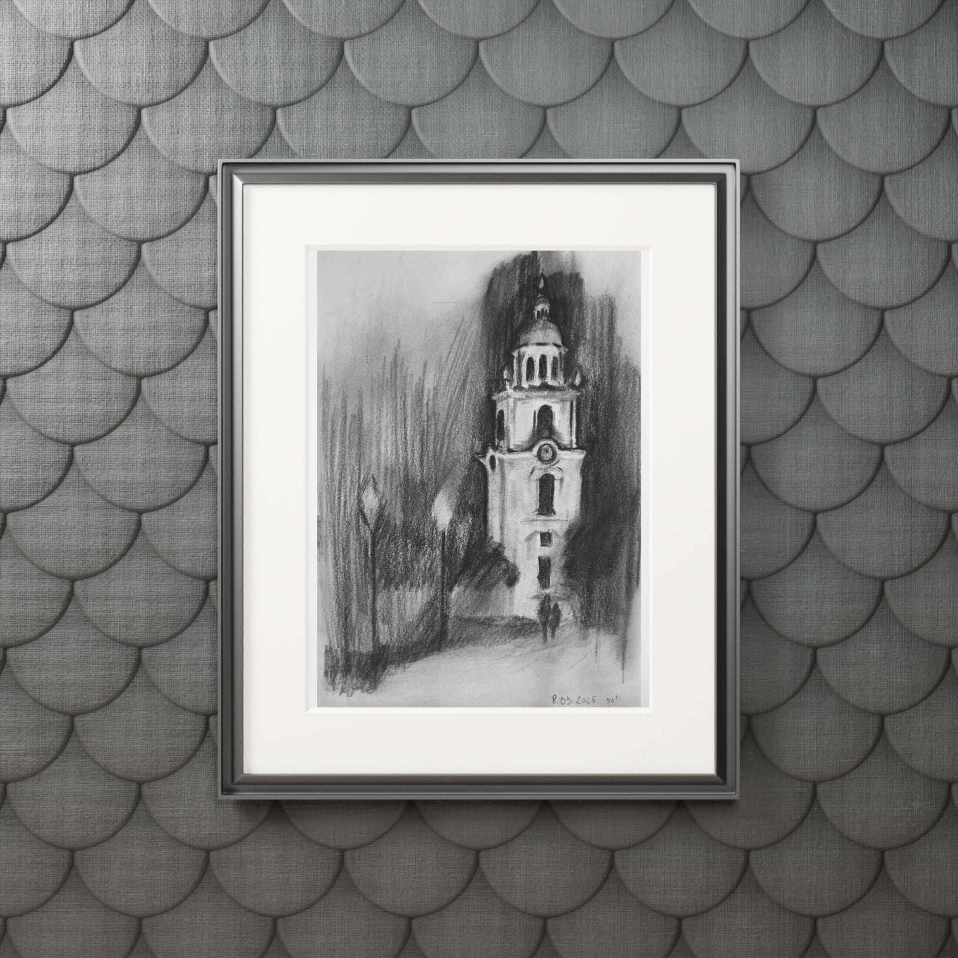 Church Tower Charcoal Drawing -  Framed Fine Art Print
