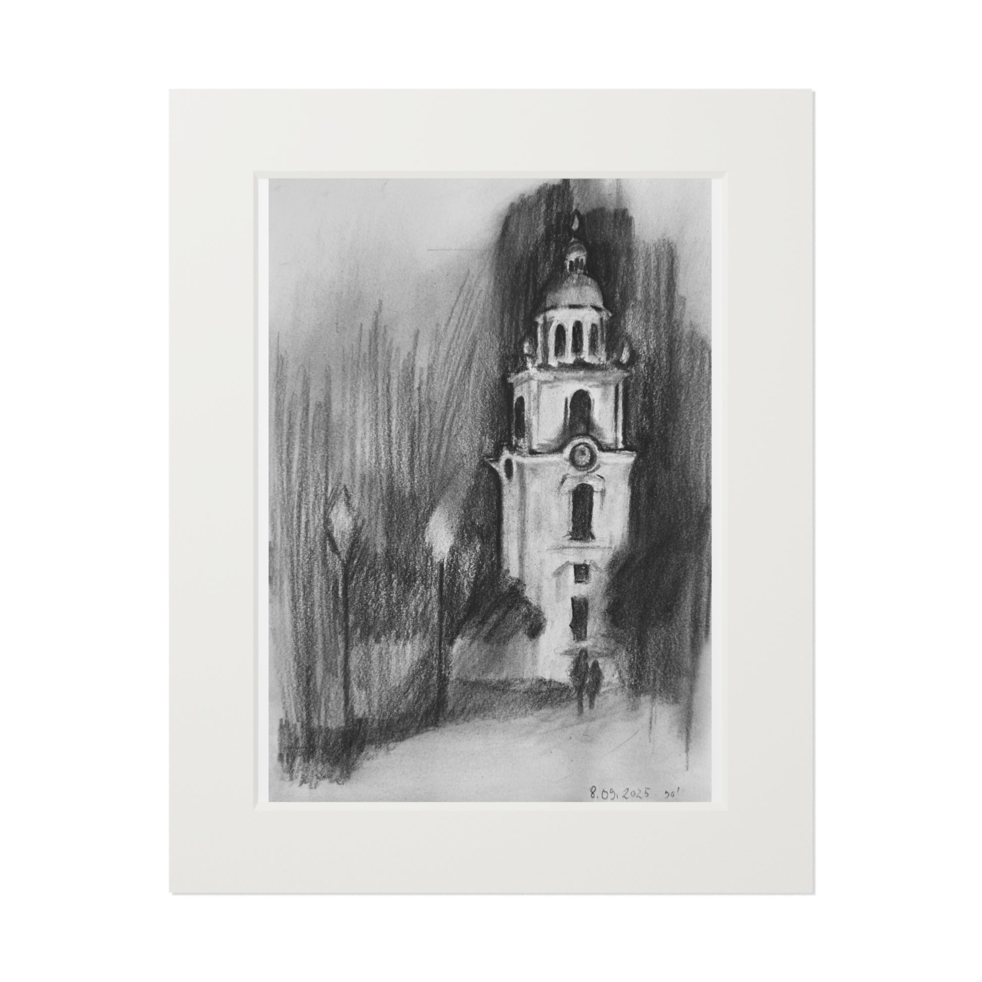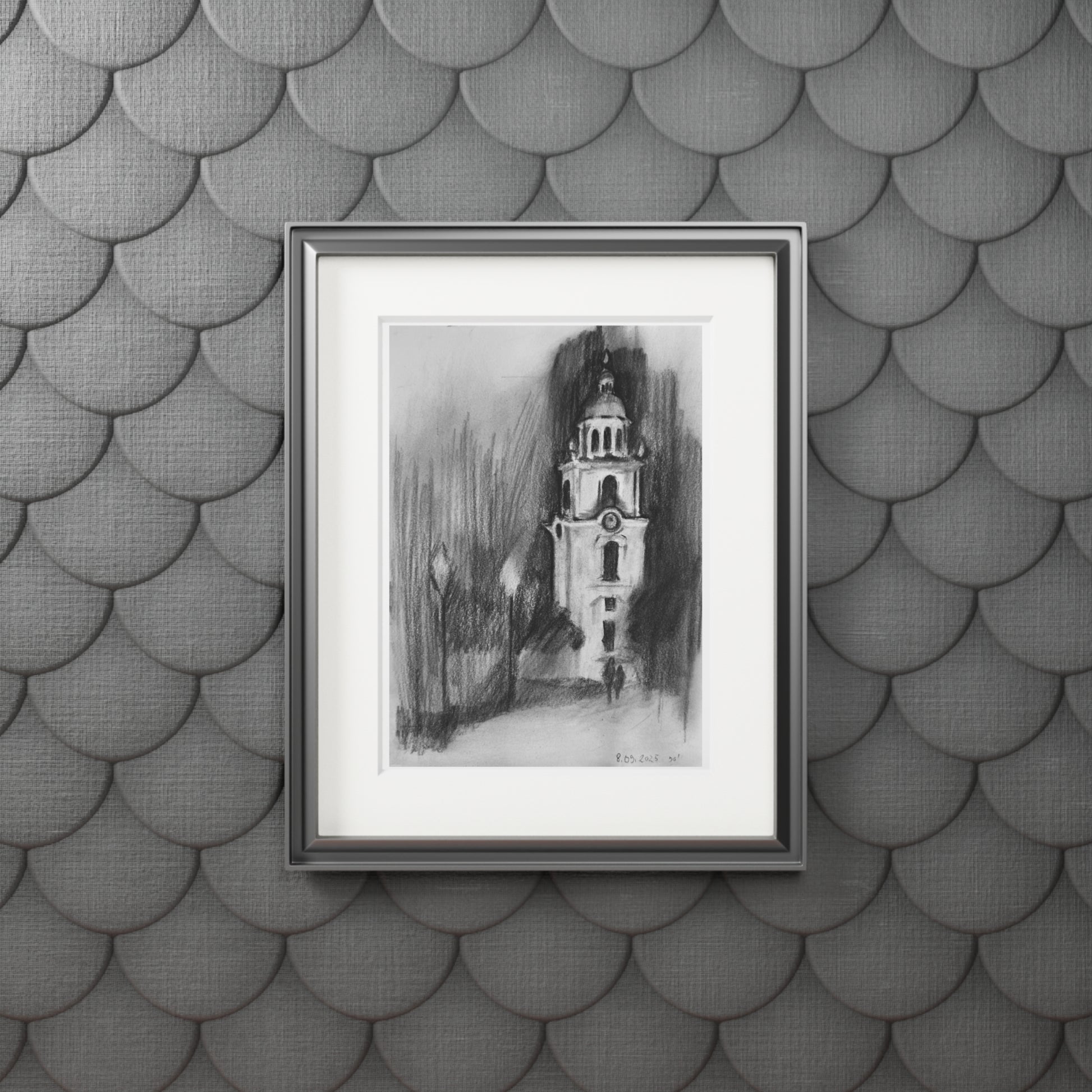 Church tower charcoal drawing - A4 (21x29.7cm)