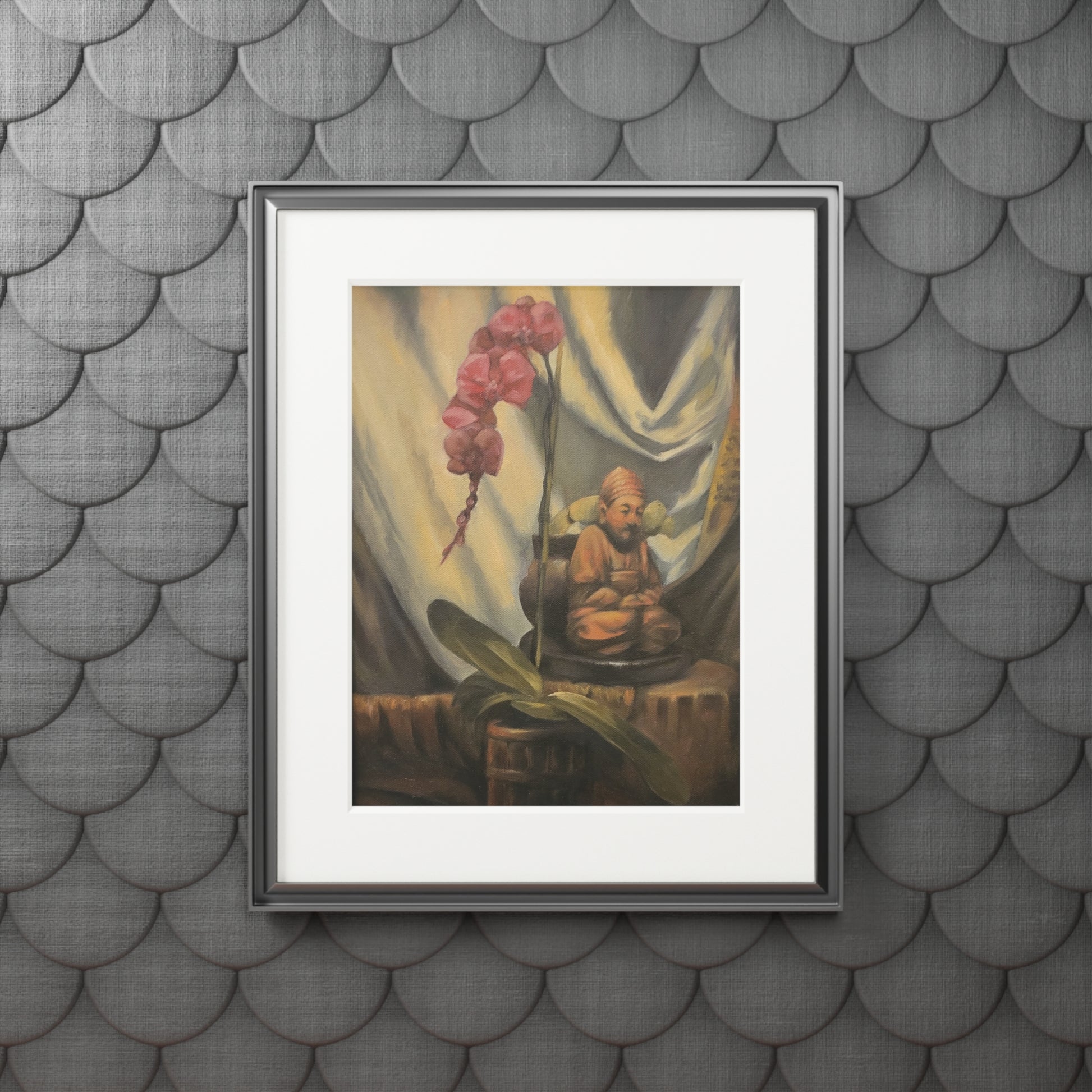 Fine art print of my "Orchid and little buddha statue" a still life oil painting of a miniature buddha statue and a pink orchid.